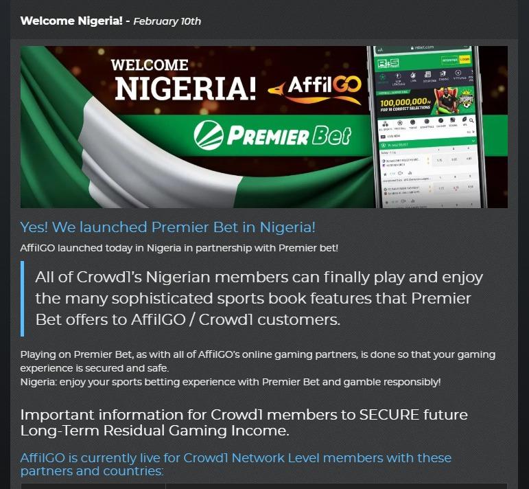 - Crowd1 Concept Yes We Launched Premier Bet In Nigeria Affilgo Launched Today In Nigeria In Partnership With Premier Bet All Of Crowd1 S Nigerian Members Can Finally Play And Enjoy The Many - Nigeria Number One Betting Website.